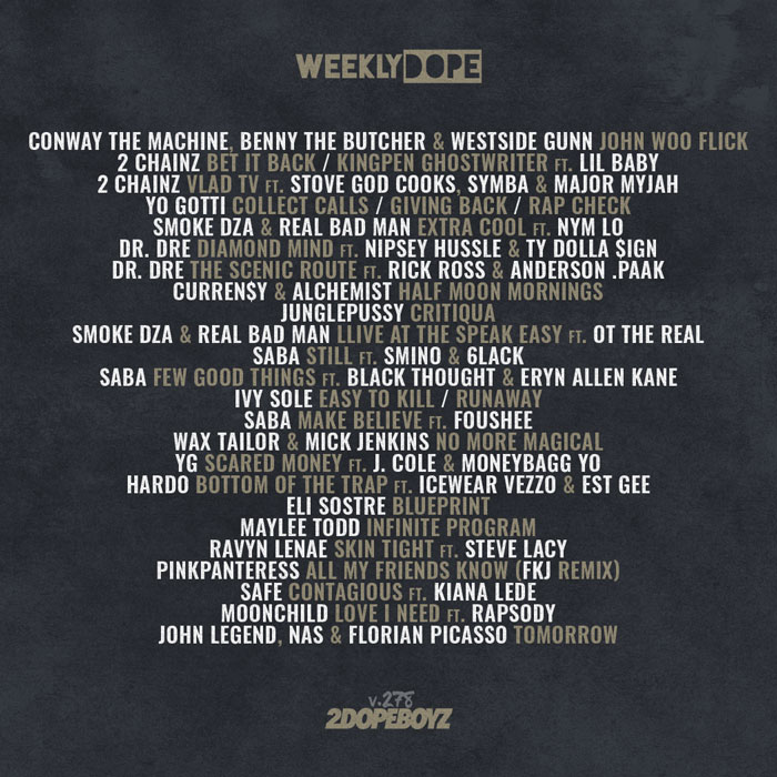 On the artwork this week, I ran with a mix of Conway Machine, Benny the Butcher and Westside Gunn for “John Woo Flick” off the Machine’s upcoming God Don’t Make Mistakes album, Dr. Dre for his GTA: The Contract music making it to streaming, 2 Chainz for Dope Don’t Sell Itself, Smoke DZA and Real Bad Man for their Mood Swings EP, and Yo Gotti for CM10: Free Game.