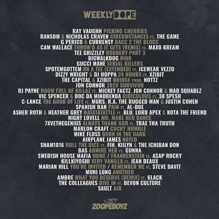 On top of that, there’s also new music from Gucci Mane, G Perico + Curren$y, Jon Connor, Dizzy Wright, Tee Grizzley, Marlon Craft, Vic Spencer, 7xvethegenius, Airplane James, Sham1016, and more.